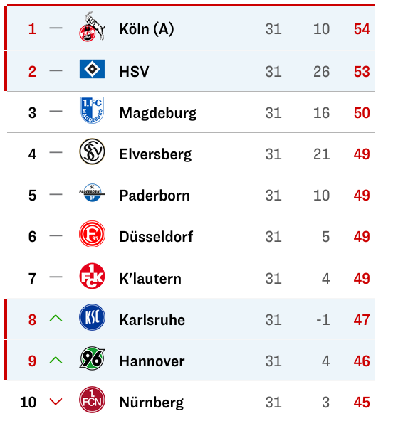 Joa, so kam es dann auch. Die ersten sechs Teams der aktuellen Tabelle haben allesamt nicht gewinnen können, stattdessen docken von hinten nun K’lautern, Karlsruhe und Hannover an womit die halbe Liga in den Aufstiegskampf involviert ist. Drei Spieltage vor dem Ende wohlgemerkt. Irre!