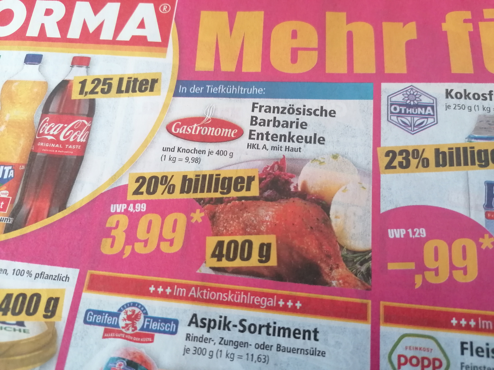Habe jetzt Ententeile (Keulen, Flügel, Brust) 1.500 g für 14,99 Euro bekommen. Damit kann ich leben.