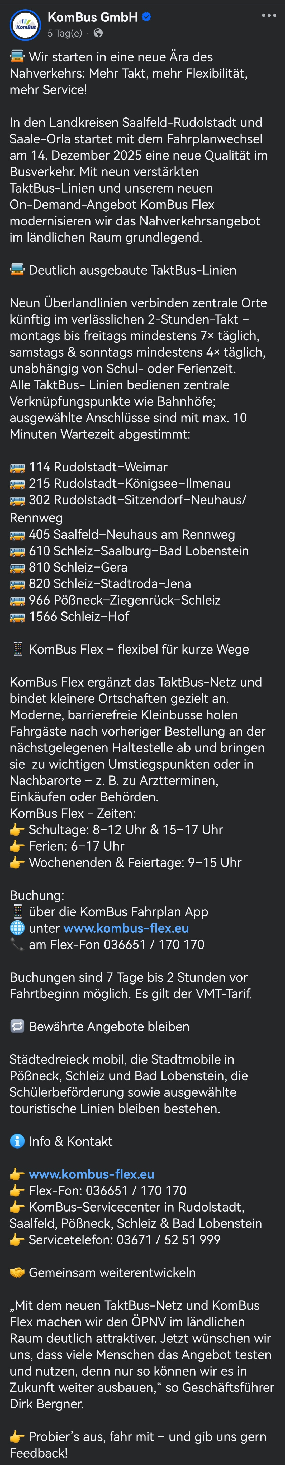 Hier sind unter der Woche alle Verbindungen zwischen 8:00 und 12:00 Uhr, sowie zwischen 15:00 und 17:00 Uhr nur noch “KomBus Flex-Verbindungen”. (Flex sind die Ruf-Busse, KomBus die Busgesellschaft des Landkreises)
