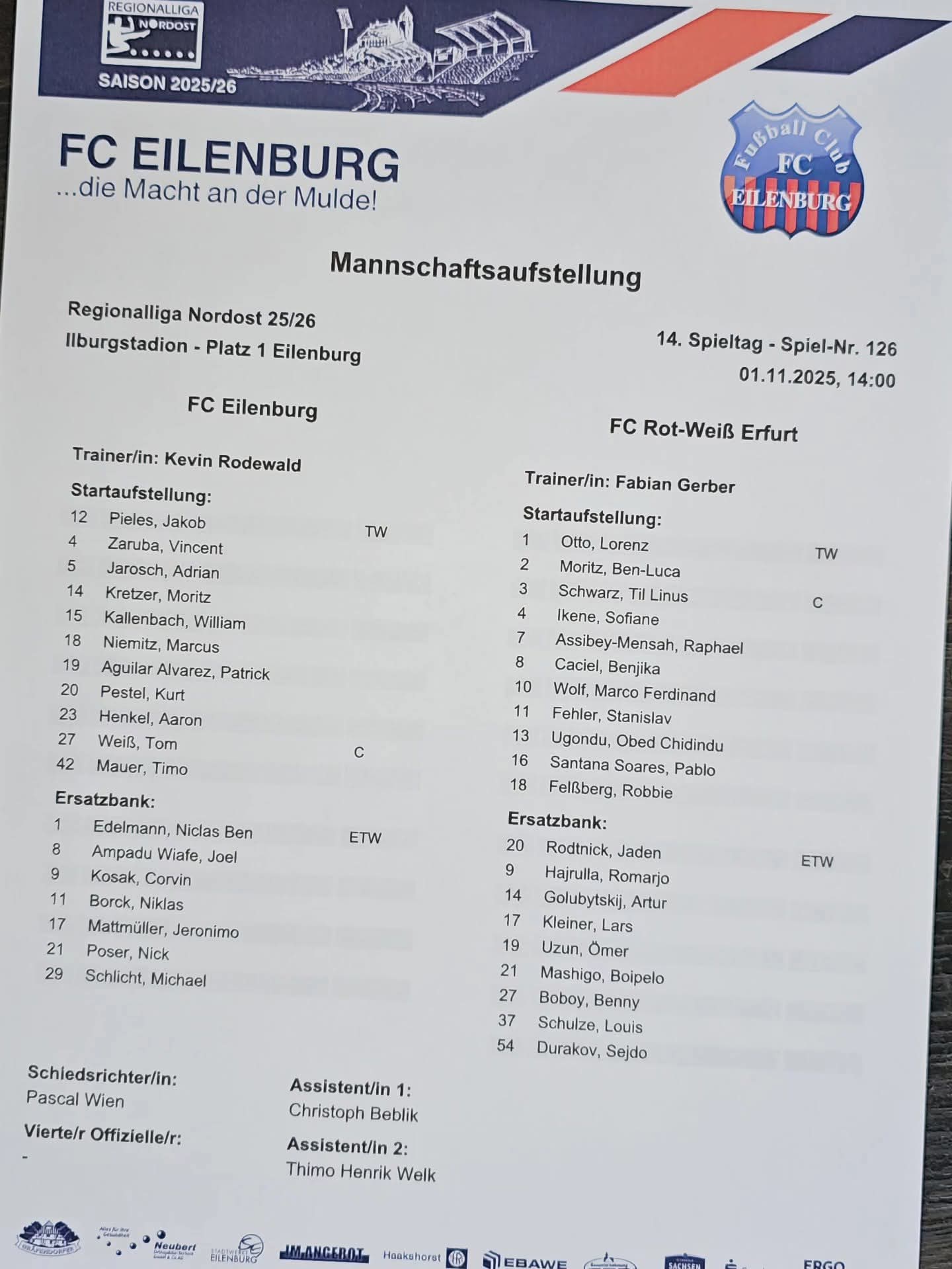 Gibt nichts zu berichten. 15 Minuten gefühlt 90 Prozent Ballbesitz, aber Eilenburg hat Heute scheinbar Schicht im Betonwerk.