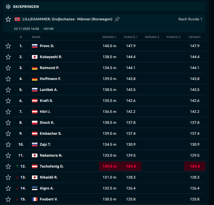 Tschofenig mit nem Super Sprung vorn. Macht ne Menge gut. Bedinungen jetzt nicht mehr so Top. 7 noch oben.