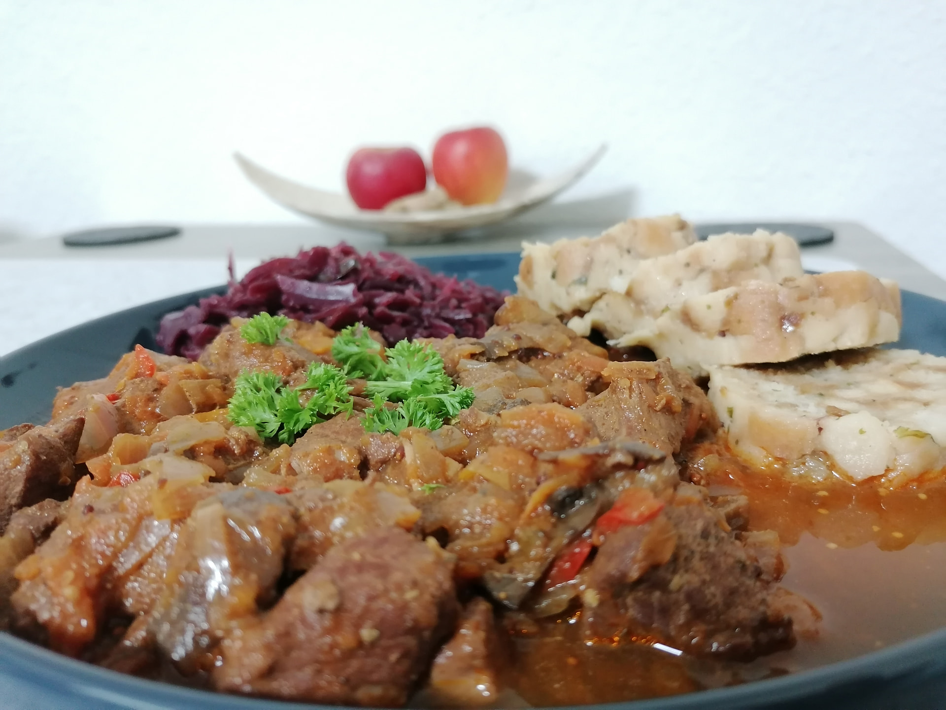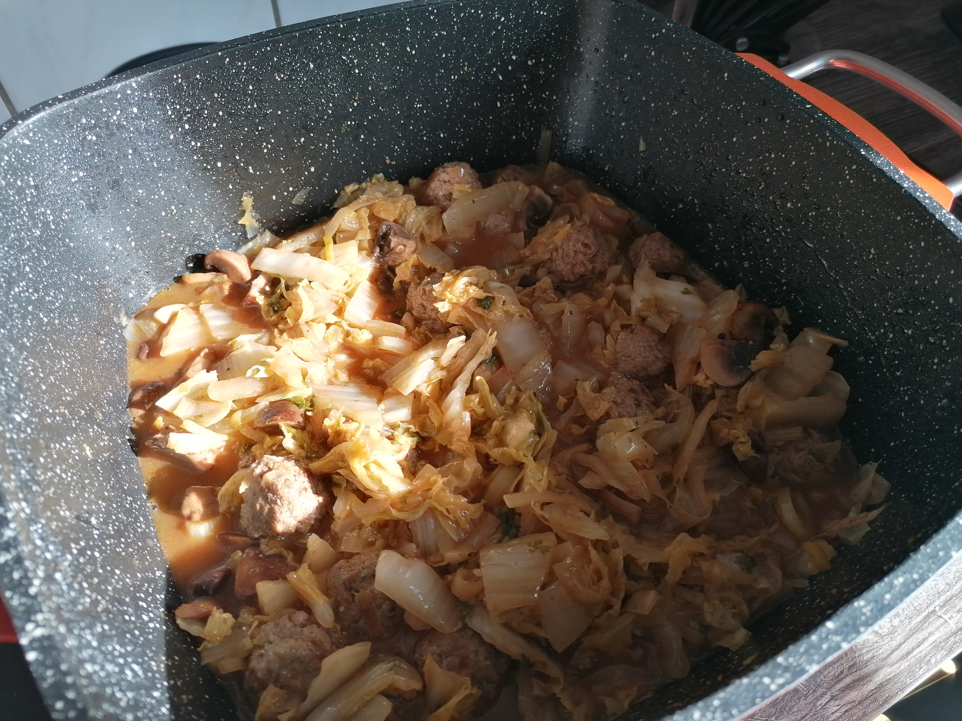 Ich mache nie wieder Schmorkohl aus Chinakohl. Junge, wo ist das alles hin? Heute Früh habe ich kaum den Deckel auf den Bräter bekommen.